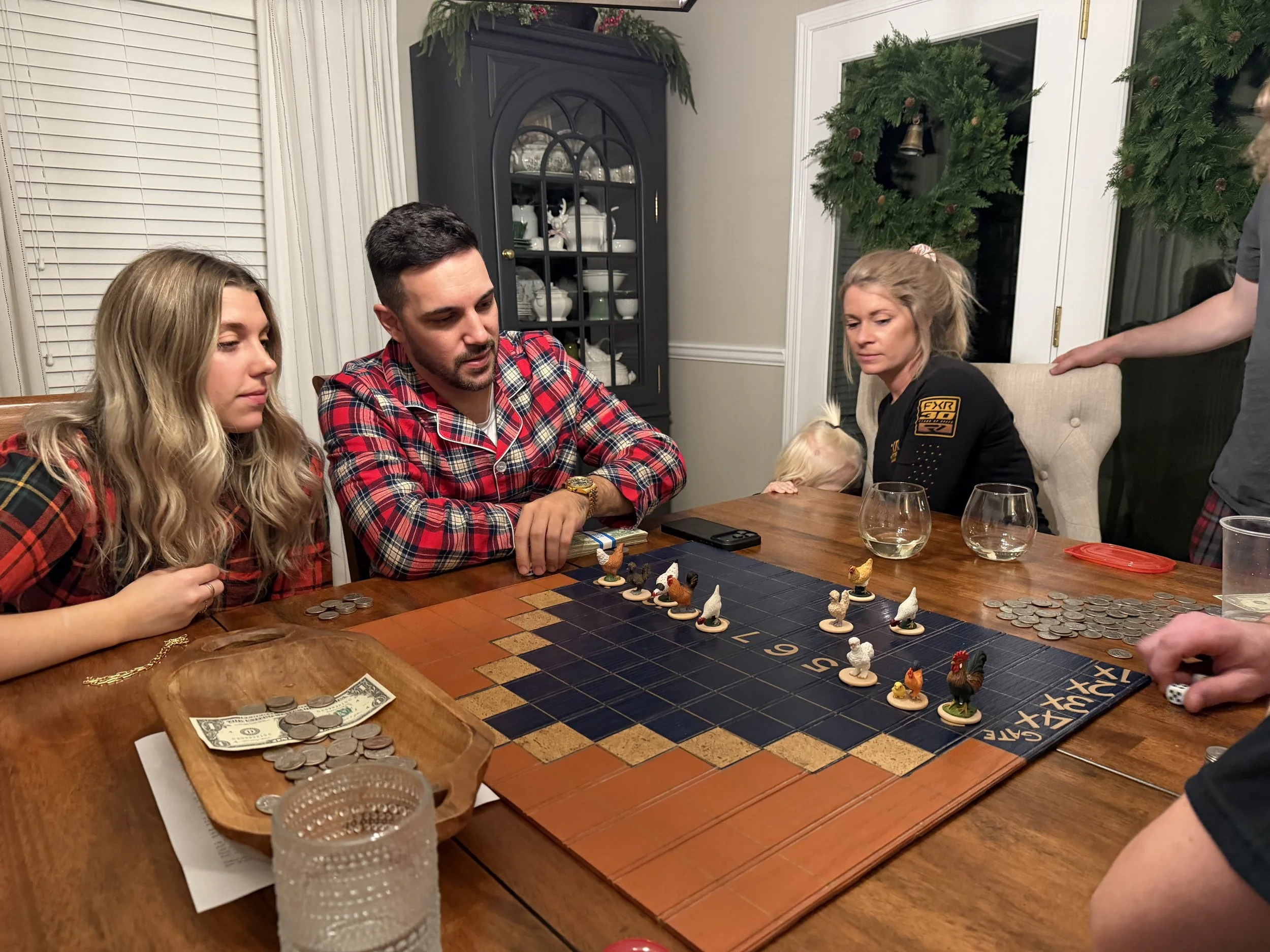 After dinner, we gathered around the table, quarters in hand, and I explained the rules. It’s a game of chance, which is exactly what makes it so fun. Dice determined how much you owed to the pot, and cards determined which chicken you were rooting for, and fate did the rest.